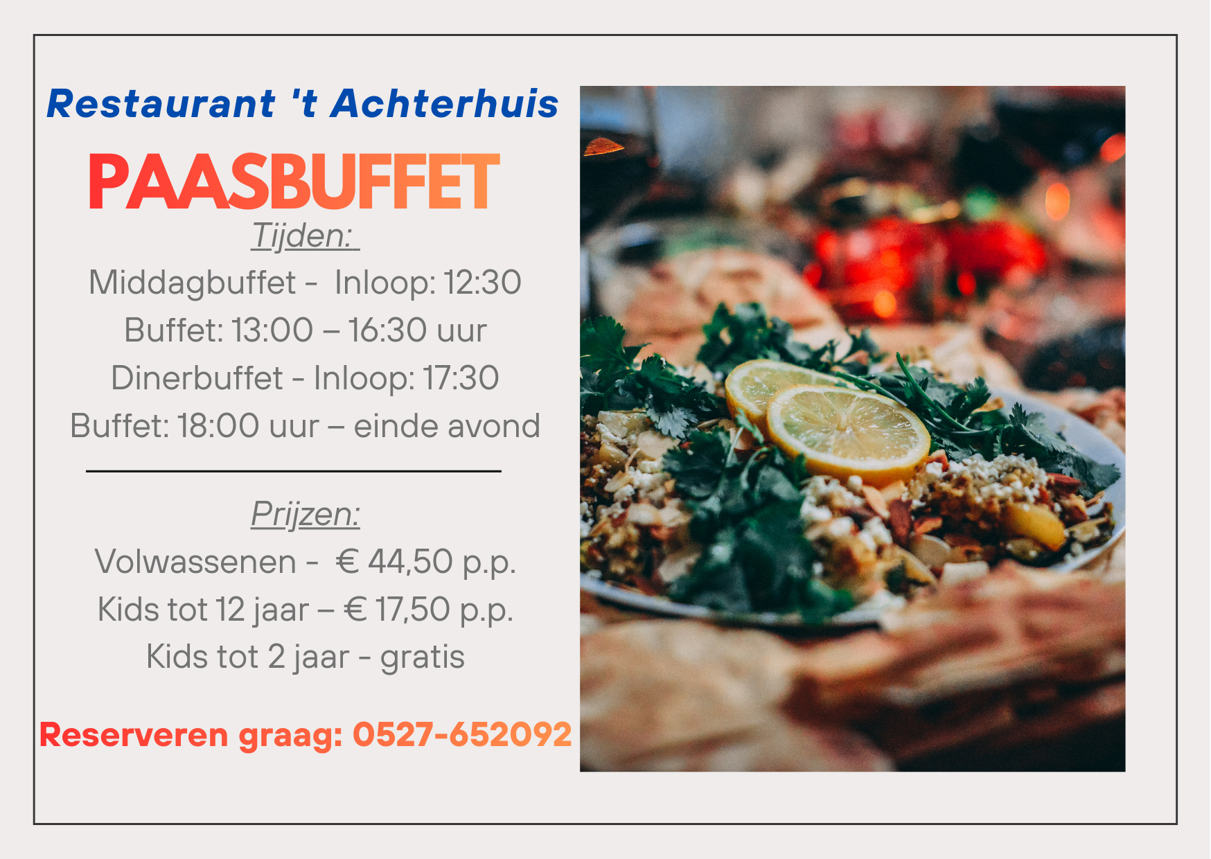 - Reserveer tijdig — ons Paasbuffet is elk jaar populair.