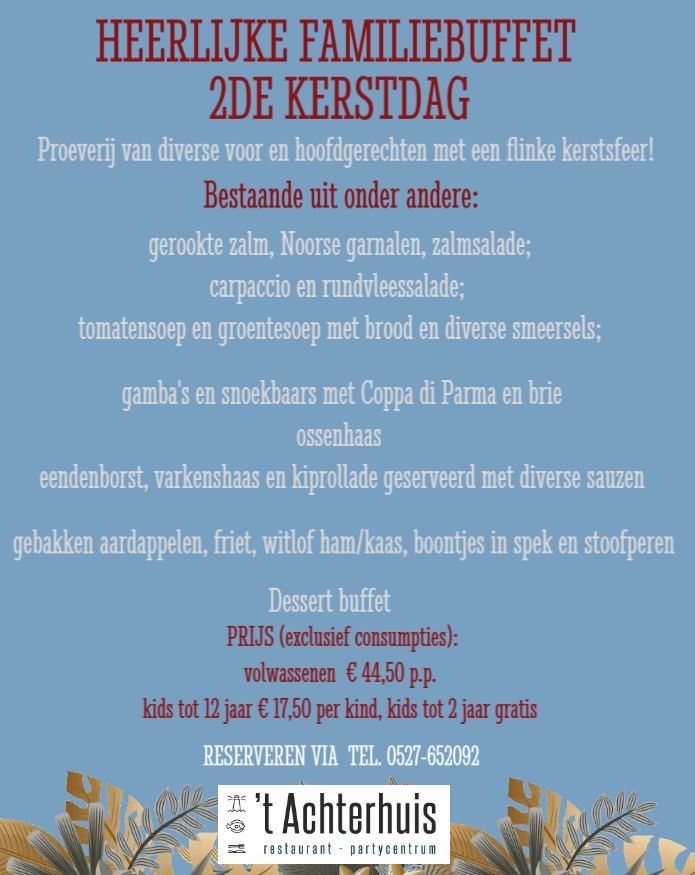 • Vier de feestdagen bij Restaurant ’t Achterhuis en geniet van een warme kerstsfeer, heerlijke gerechten en gezellig samenzijn.